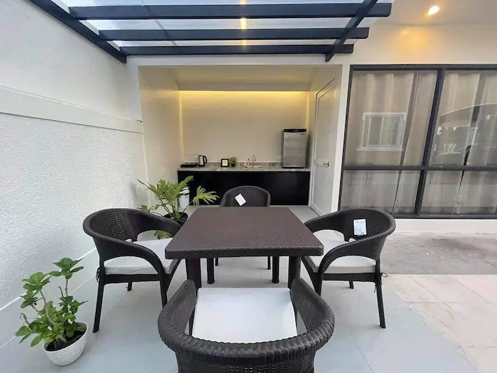 During your stay, you’ll also have a private patio where you can dine alfresco. You can cook your meals in the equipped outdoor kitchen; it has a samgyup grill, BBQ grill, basic appliances, and basic kitchen utensils.